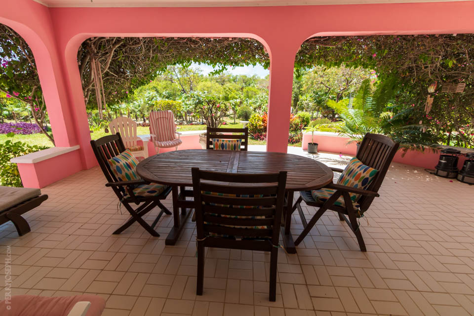 Point O Vue has the perfect setup for outdoor dining. The covered outdoor deck is surrounded by beautiful landscaping that really sets the tone for an excellent gathering and meals. Eleuthera Island, Bahamas.